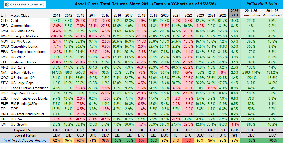 Vi ripropongo la tabella comparativa per comprendere quanto l’osservazione e l’orizzonte temporale è importante nella valutazione degli investimenti in asset digitali come Bitcoin. Dati dal 1 gennaio 2011 al 23 gennaio 2026.