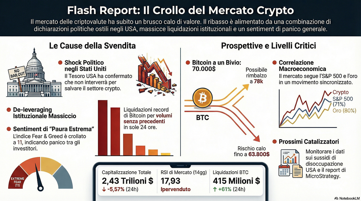 Il mercato crypto è crollato del 5,57% per uno shock politico negli USA e massicce liquidazioni istituzionali. Il panico cresce per l'assenza di salvataggi statali. Il futuro dipende dalla tenuta del supporto a 70.000$ di Bitcoin e dai prossimi dati macroeconomici americani.