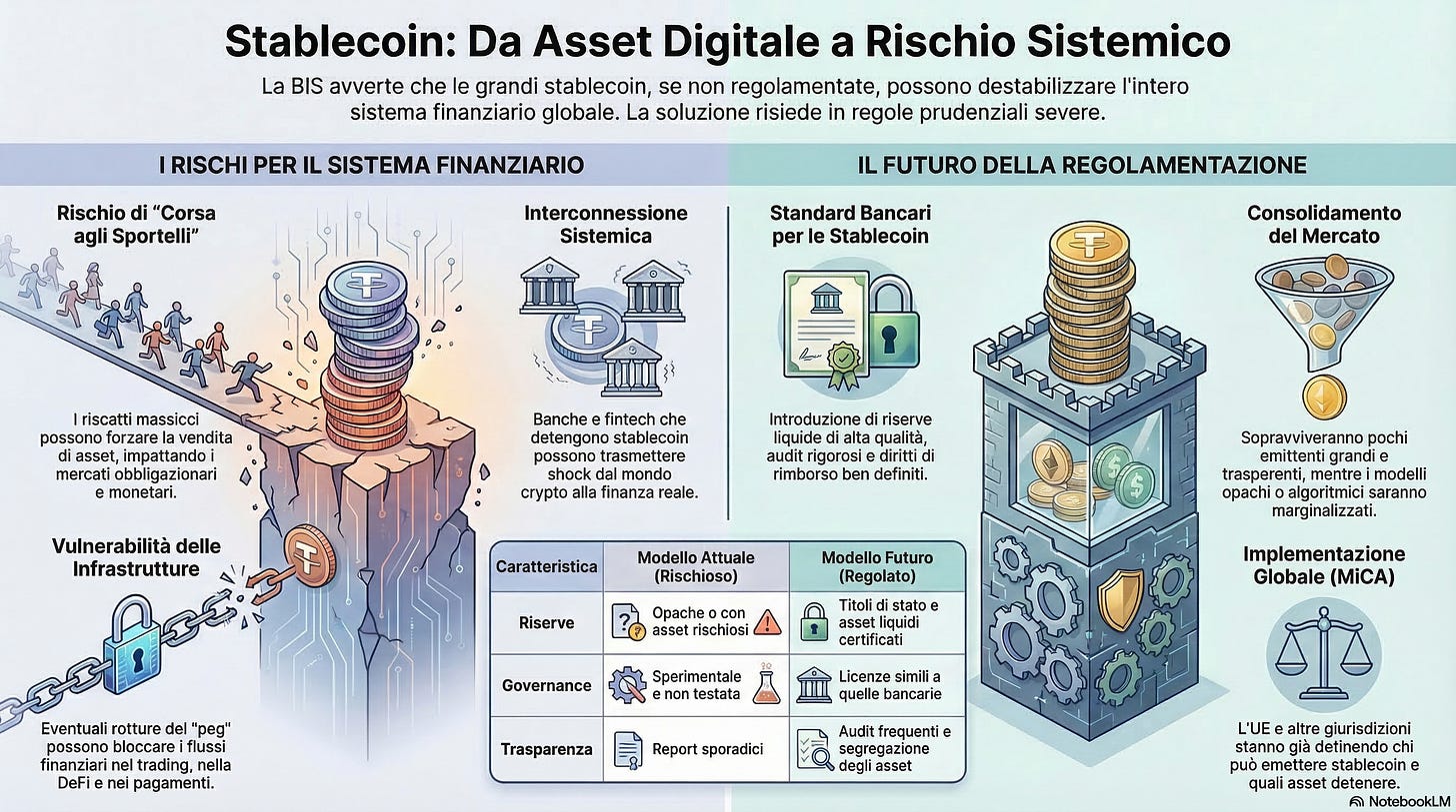 Secondo la BIS, la crescita delle stablecoin porta con sé responsabilità sistemiche che non possono più essere ignorate. Se lasciate operare in un vuoto regolamentare, queste monete digitali potrebbero innescare crisi capaci di travalicare i confini del mondo crypto. Questo intervento non deve essere interpretato come un tentativo di soffocare l’innovazione, ma come un’evoluzione necessaria: il segnale che il settore ha raggiunto una massa critica tale da richiedere una maturità istituzionale definitiva.
